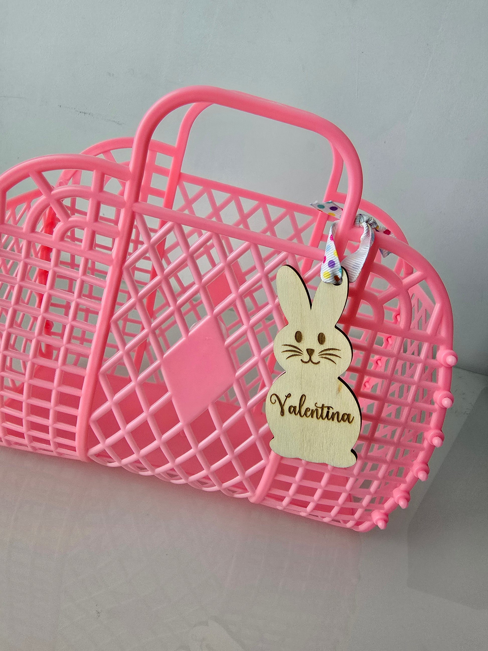 Enhance your Easter celebrations with our Jelly Plastic Tote Bags. Adorable bunny cutout with a custom name included. Durable and stylish for all your Easter needs.